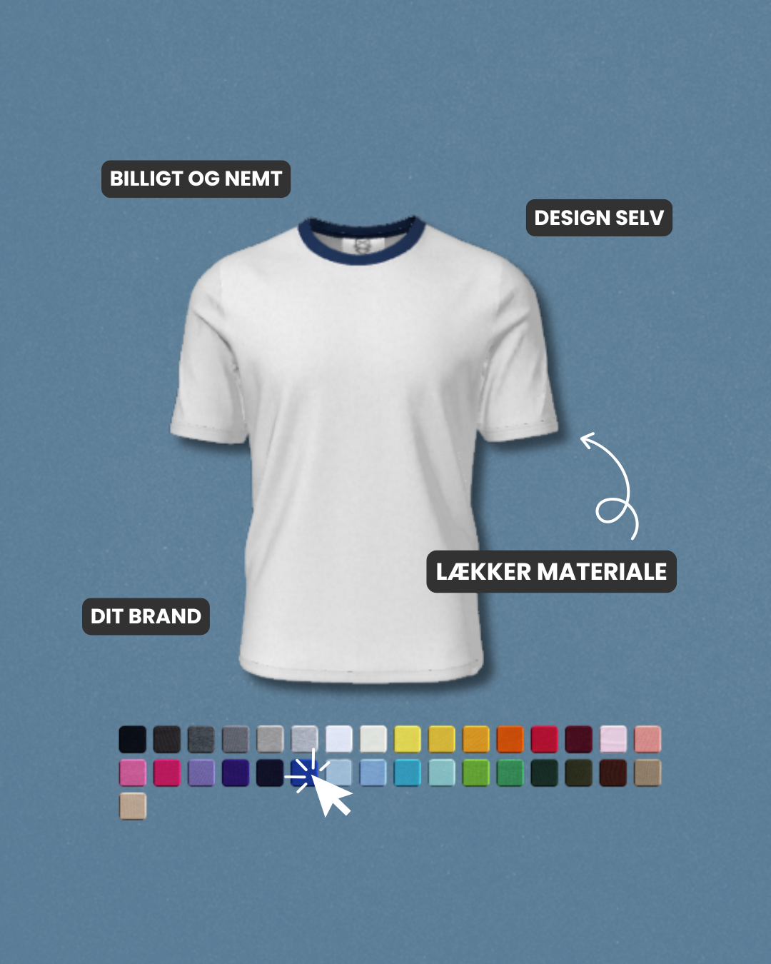 En T-shirt består af fem elementer: krave, ærmer, front, ryg og syninger. I vores 3D-designer kan du frit vælge farver på alle fem elementer, helt uden merpris.